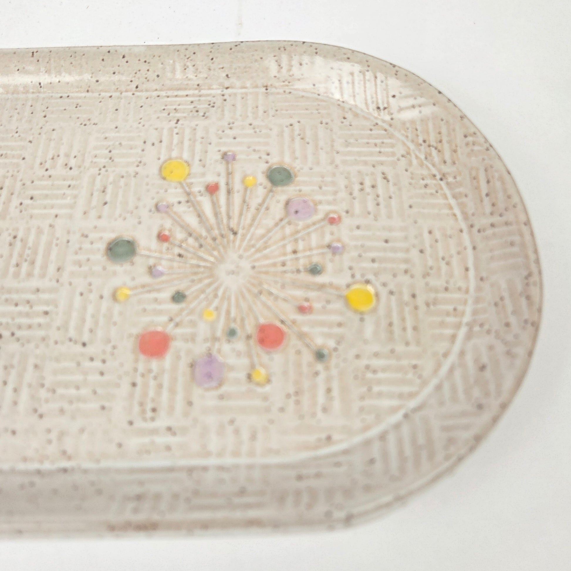 This beautiful stoneware oval tray features an elegant Art Deco sunburst pattern design and is hand built and hand glazed with care in our Ohio studio. The colors of the burst will vary and may not exactly match the picture, adding to the uniqueness of each piece.