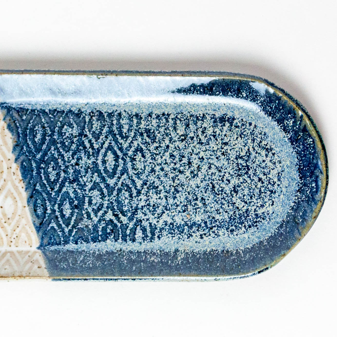 This beautiful stoneware ceramic tray features a white and blue diamond pattern and is hand-built and hand-glazed in Oberlin, Ohio, USA by Kim or Jack. Measuring approximately 12" long by 4" wide, it’s a versatile piece—perfect for serving bread, appetizers, or desserts, or for use as a decorative accent in your home.
