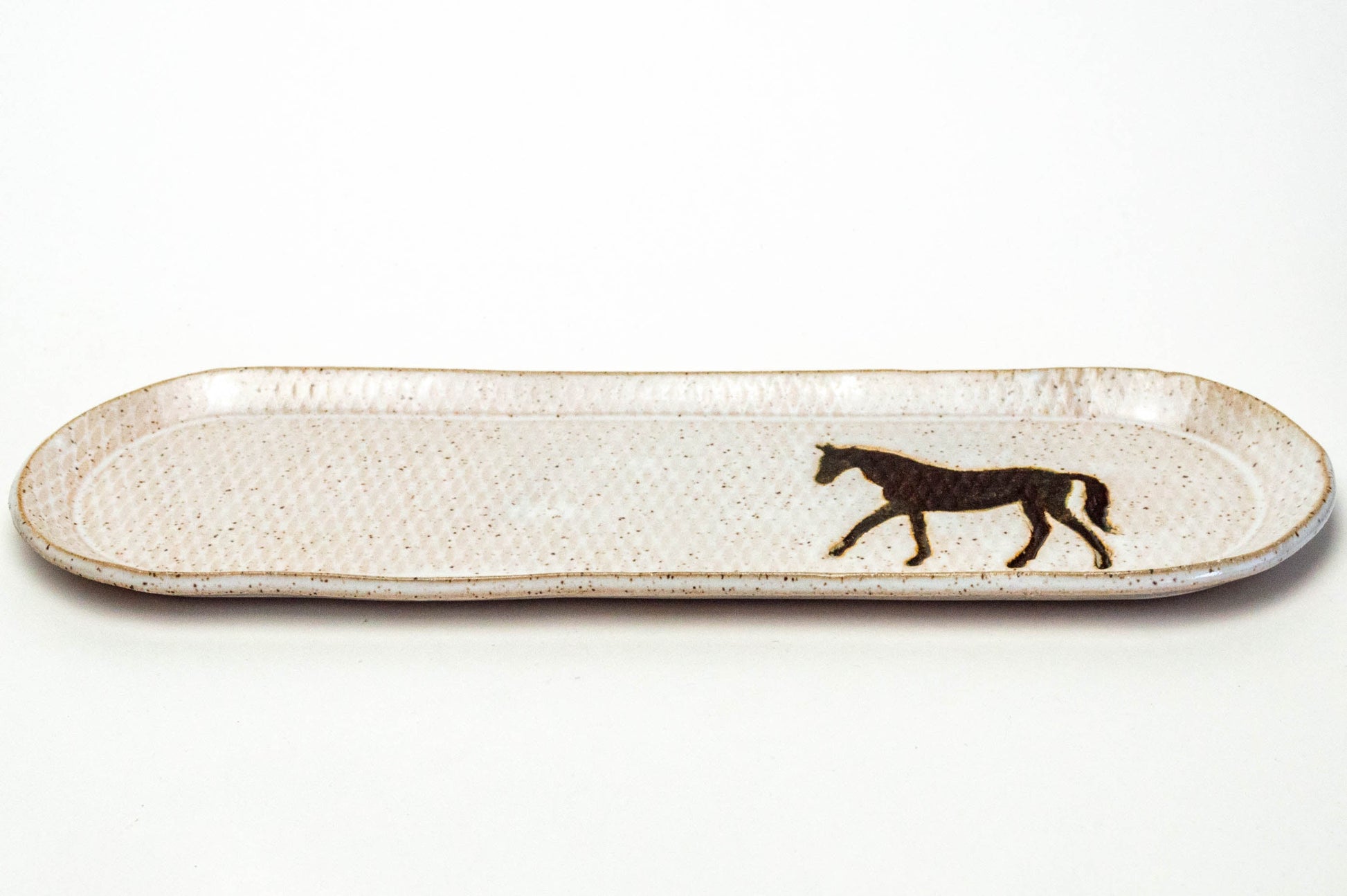 This beautiful stoneware ceramic tray is hand-built and hand-glazed, featuring a delicately impressed horse design. Measuring approximately 12" long by 4" wide, it’s the perfect size for serving bread, appetizers, or simply displaying as a handmade accent piece.