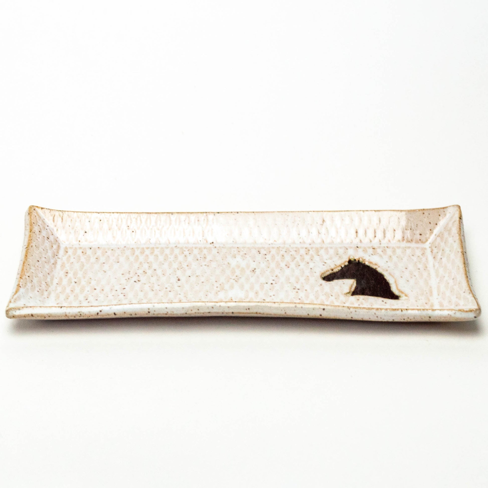 This beautiful stoneware tray features a brown horse design, hand-built and hand-glazed with care in Oberlin, Ohio. Measuring approximately 7½" long by 3" wide, it’s the perfect size for serving butter, olives, or small bites. Food, dishwasher, and microwave safe, it’s made to be both functional and timeless. Each tray is individually handmade, so no two will ever be exactly the same—slight variations in color, glaze, and form make every piece one of a kind.