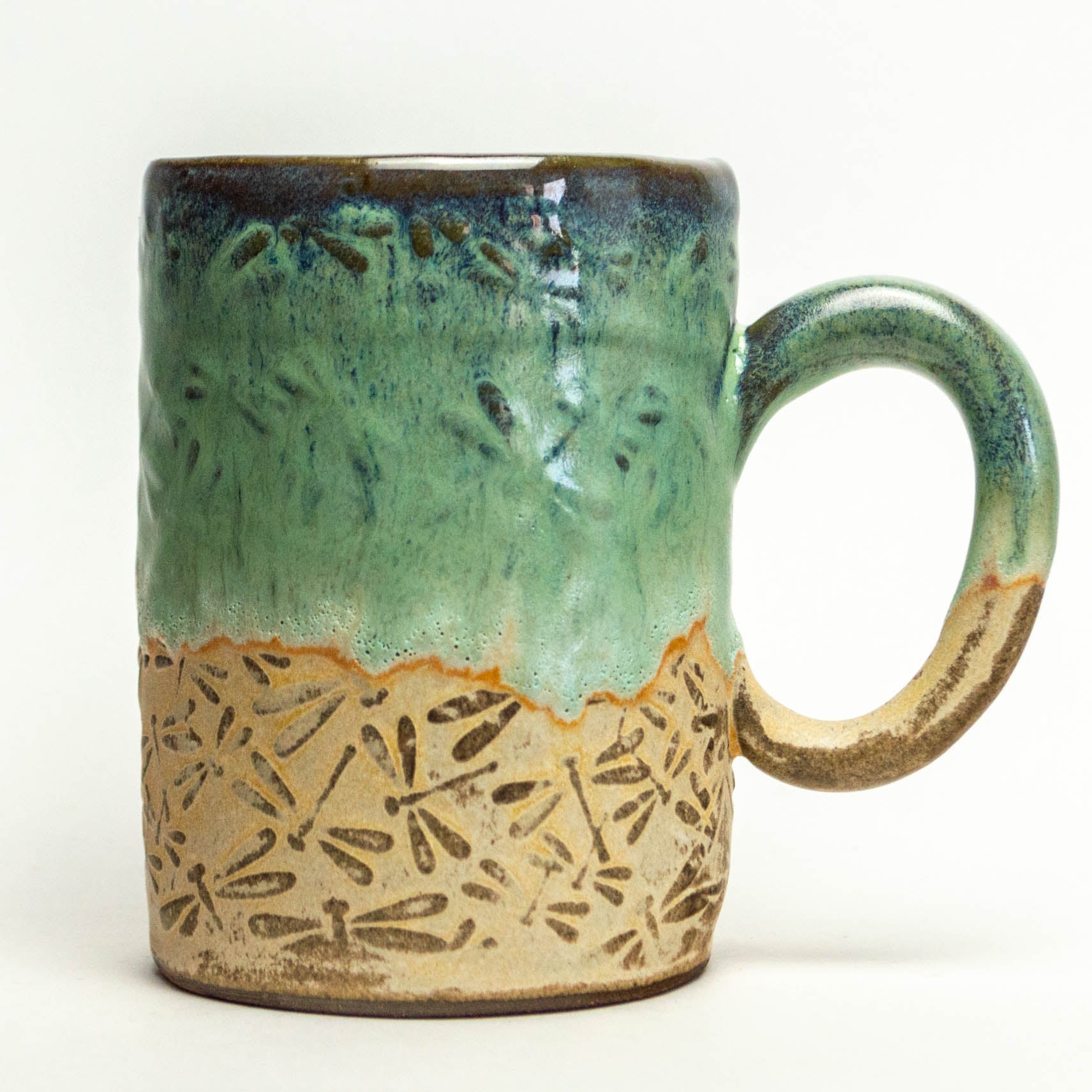 Green Dragonfly Pattern Handmade Chocolate Stoneware 14 oz Mug