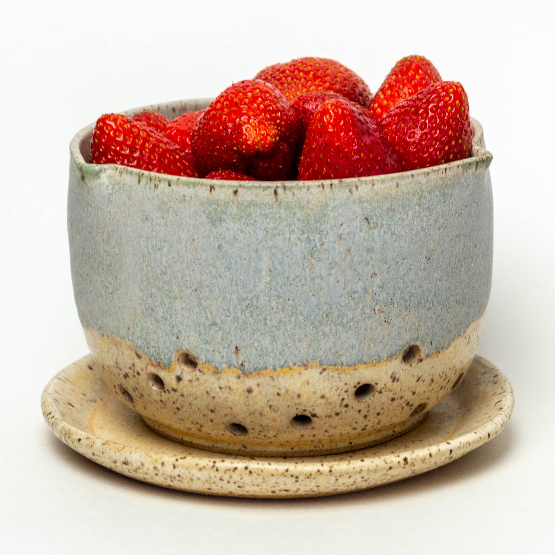 This beautiful stoneware ceramic berry bowl, colander, or orchid pot features a soft blue and beige glaze and is hand-thrown and hand-glazed in Ohio, USA. Designed to be both practical and beautiful, it’s a versatile piece for everyday use or display.