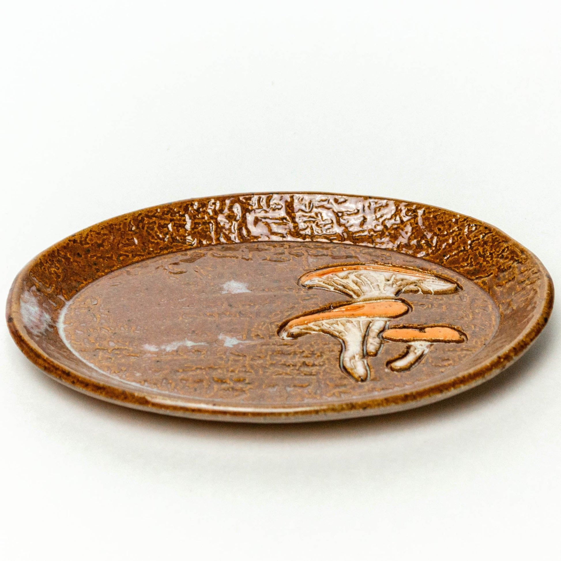 Jack-O'-Lantern Mushroom on Brown Oval Stoneware Trinket Dish
