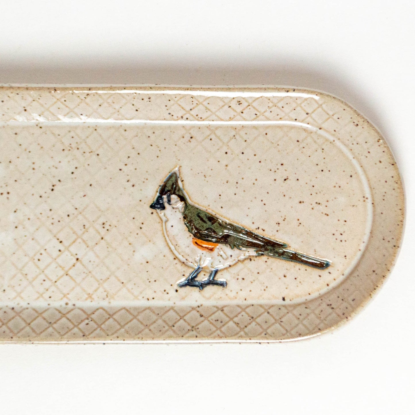 Bring a touch of woodland charm to your table with this beautiful stoneware ceramic oval tray, featuring an adorable Tufted Titmouse impressed into the design! Hand-built and hand-glazed with care in Ohio, this versatile tray measures approximately 12 inches long by 4 inches wide—perfect for serving appetizers, holding trinkets, or adding a nature-inspired accent to any space. Food, dishwasher, and microwave safe, it’s as practical as it is lovely. Each tray is uniquely handmade, so no two are ever exactly alike, with delightful variations in color and detail. A sweet piece for bird lovers and rustic homes alike!