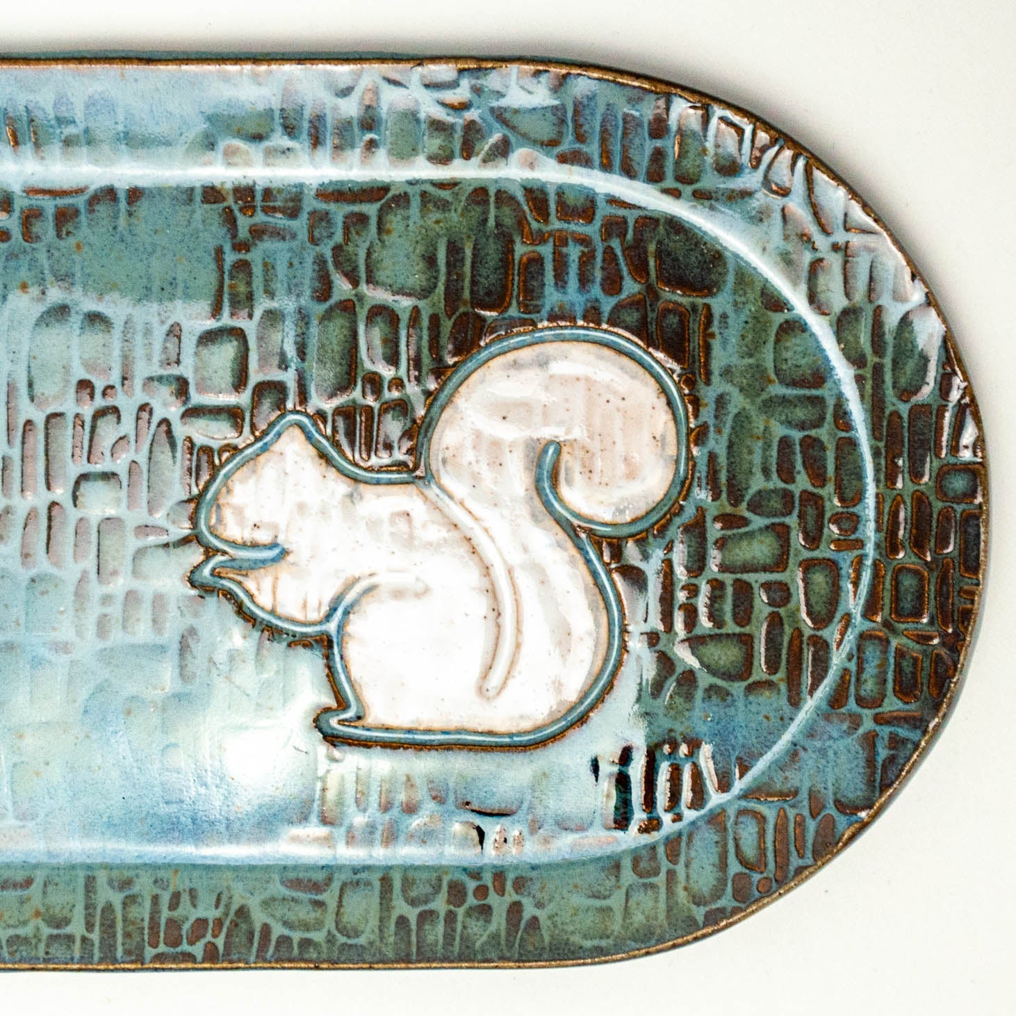 This beautiful stoneware ceramic tray features a white squirrel design on a blue background and is hand-built and hand-glazed in Ohio, USA. Measuring approximately 10" long by 5" wide, it’s a versatile piece—perfect for serving appetizers, bread, or desserts, or as a decorative accent in your home.