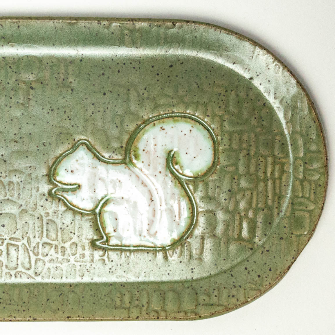 This beautiful stoneware ceramic platter features a white squirrel design on a green background and is hand-built and hand-glazed in Oberlin, Ohio, USA. Measuring approximately 10" long by 5" wide, it’s the perfect size for serving breads, cheeses, or appetizers—and equally lovely as a decorative accent.