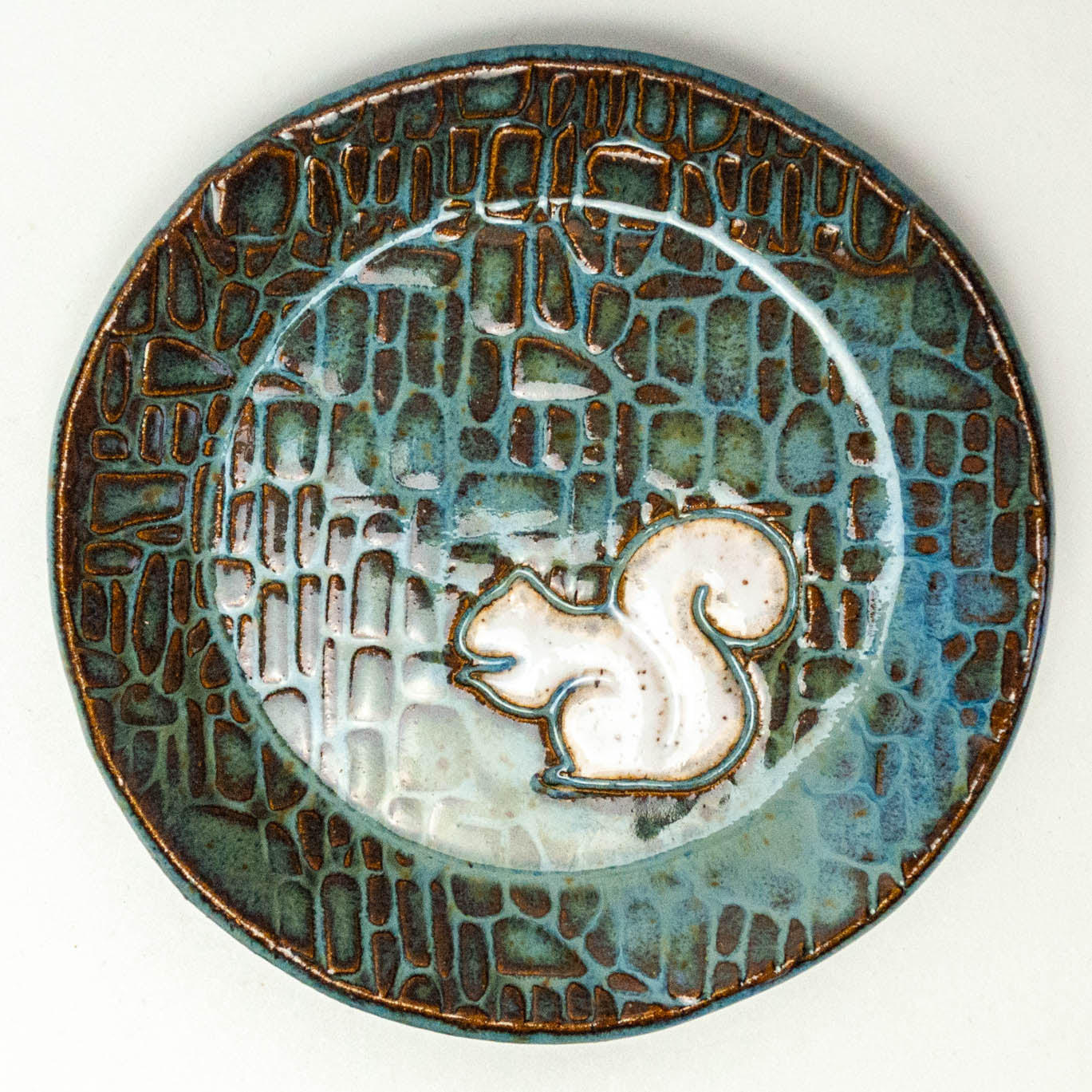 This beautiful stoneware ceramic trinket dish features a white squirrel design on a blue background, hand-built and hand-glazed in Oberlin, Ohio, USA. Measuring approximately 4¼" wide, it’s the perfect size for jewelry, coins, keys, or other small treasures.