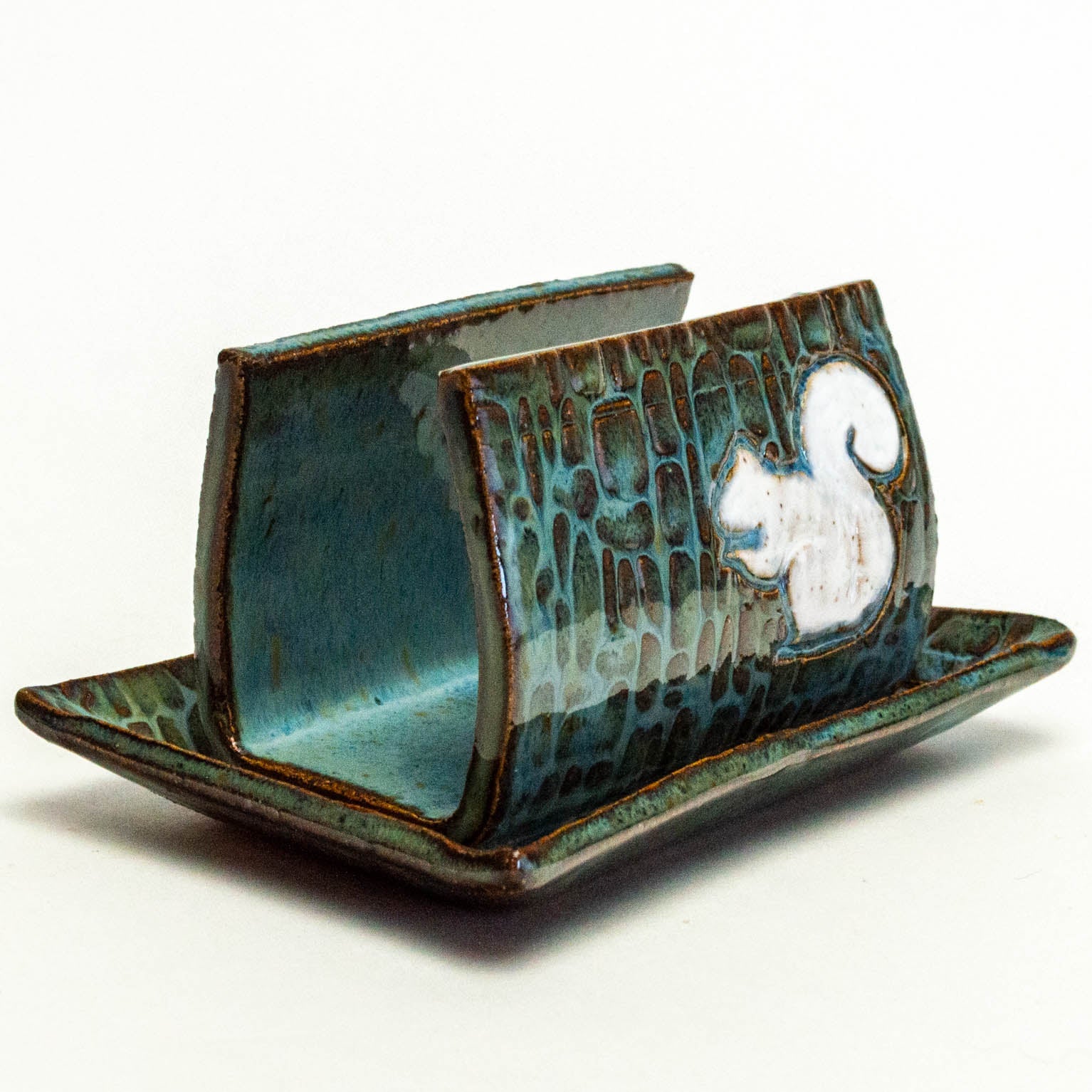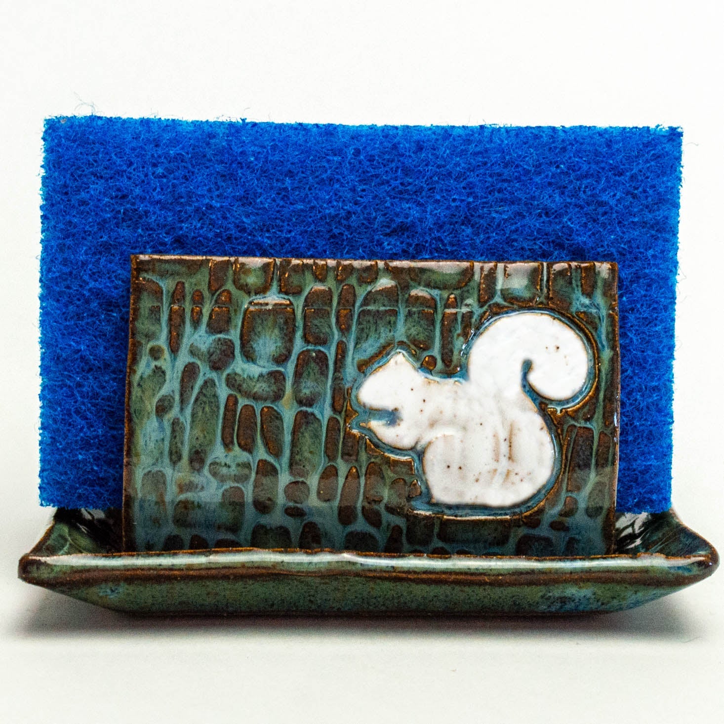 This beautiful stoneware ceramic sponge holder features a white squirrel pattern on a blue background, hand-built and hand-glazed in Oberlin, Ohio, USA. Measuring approximately 4" long by 3" wide and 2.5" high, it’s the perfect way to keep your sponge handy while adding a touch of handmade charm to your kitchen.