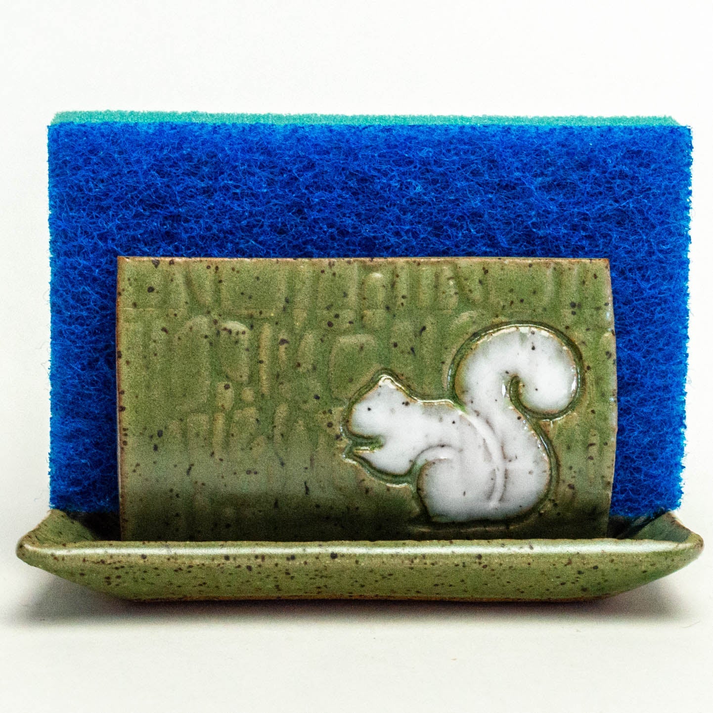 This beautiful stoneware ceramic sponge holder features a white squirrel pattern on a green background and is hand-built and hand-glazed in Oberlin, Ohio, USA. Measuring approximately 4" long by 3" wide and 2.5" high, it’s the perfect way to keep your kitchen sink neat while adding a touch of handmade charm.