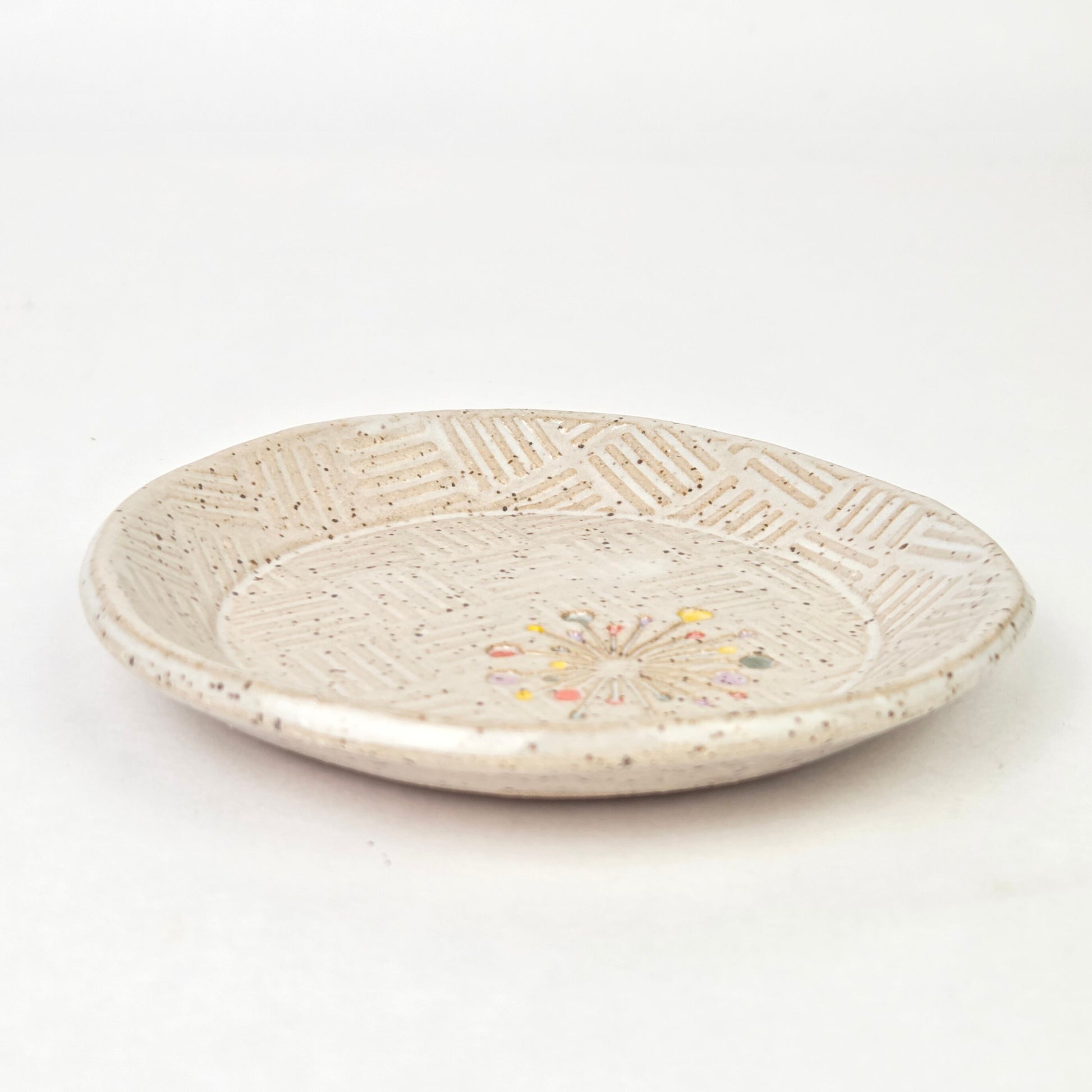 This beautiful Art Deco Sunburst-patterned round trinket dish is crafted on white glazed stoneware and is hand-built and hand-glazed in Oberlin, Ohio, USA. Measuring approximately 4 1/4 inches wide, it is the perfect size for holding jewelry, keys, coins, or other small treasures.